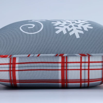 - Reversible: “Merry Christmas” messaging and white snowflakes on a gray ground on the front; gray, white, and red plaid on the reverse