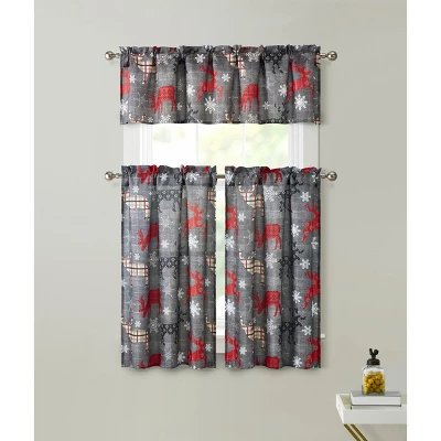 Prep your home for the holidays with this classic country farmhouse plaid themed Christmas kitchen curtain tier and valance set by Kate Aurora Holiday Living. Made of finely woven polyester fabric these cafe window curtain treatments will instantly add a pop of holiday cheer to any room. Features adorable reindeer and snowflakes to portray the ultimate holiday feel. Comes fully hemmed and ready to hang right out of the package this product has been made for years to come.